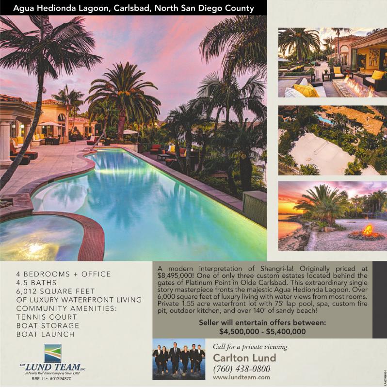 Agua Hedionda Lagoon, Carlsbad, North San Diego County 4 BEDROOMS + OFFICE 4.5 BATHS 6,012 SQUARE FEET OF LUXURY WATERFRONT LIVING COMMUNITY AMENITIES: TENNIS COURT BOAT STORAGE BOAT LAUNCH BRE. Lic. #01394870 A modern interpretation of Shangri-la! Originally priced at $8,495,000! One of only three custom estates located behind the gates of Platinum Point in Olde Carlsbad. This extraordinary single story masterpiece fronts the majestic Agua Hedionda Lagoon. Over 6,000 square feet of luxury living with water views from most rooms. Private 1.55 acre waterfront lot with 75’ lap pool, spa, custom fire pit, outdoor kitchen, and over 140’ of sandy beach! Seller will entertain offers between: $4,500,000 - $5,400,000 Call for a private viewing Carlton Lund (760) 438-0800 www.lundteam.com