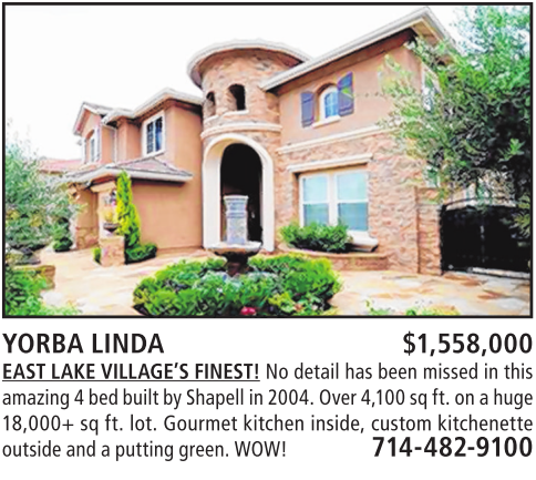 YORBA LINDA $1,558,000 EAST LAKE VILLAGE’S FINEST! No detail has been missed in this amazing4bed builtbyShapell in 2004.Over4,100 sq ft.onahuge 18,000+ sqft. lot. Gourmet kitchen inside, custom kitchenette outsideand aputting green. WOW! 714-482-9100