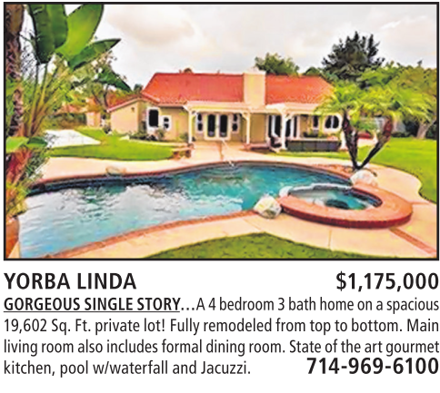 YORBA LINDA $1,175,000 GORGEOUS SINGLE STORY…A4bedroom3bathhome on aspacious 19,602 Sq. Ft.privatelot!Fullyremodeledfrom toptobottom. Main living room alsoincludes formal diningroom.State of theart gourmet kitchen,poolw/waterfall andJacuzzi. 714-969-6100