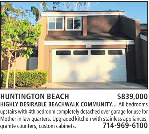 HUNTINGTON BEACH $839,000 HIGHLY DESIRABLE BEACHWALK COMMUNITY... All bedrooms upstairswith4th bedroomcompletelydetachedovergaragefor usefor Mother in law quarters.Upgradedkitchen with stainless appliances, granite counters, custom cabinets. 714-969-6100