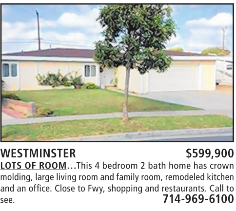 WESTMINSTER $599,900 LOTS OF ROOM…This 4 bedroom 2 bath home has crown molding,large living room and family room, remodeledkitchen and anoffice. Close toFwy, shopping and restaurants. Call to see. 714-969-6100