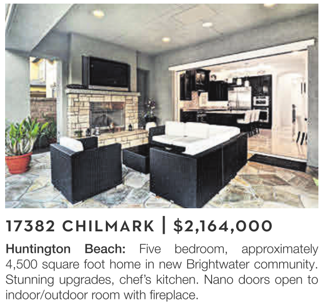 Huntington Beach: Five bedroom, approximately 4,500 square foot home in new Brightwater community. Stunning upgrades, chef’s kitchen. Nano doors open to indoor/outdoor room with fireplace.