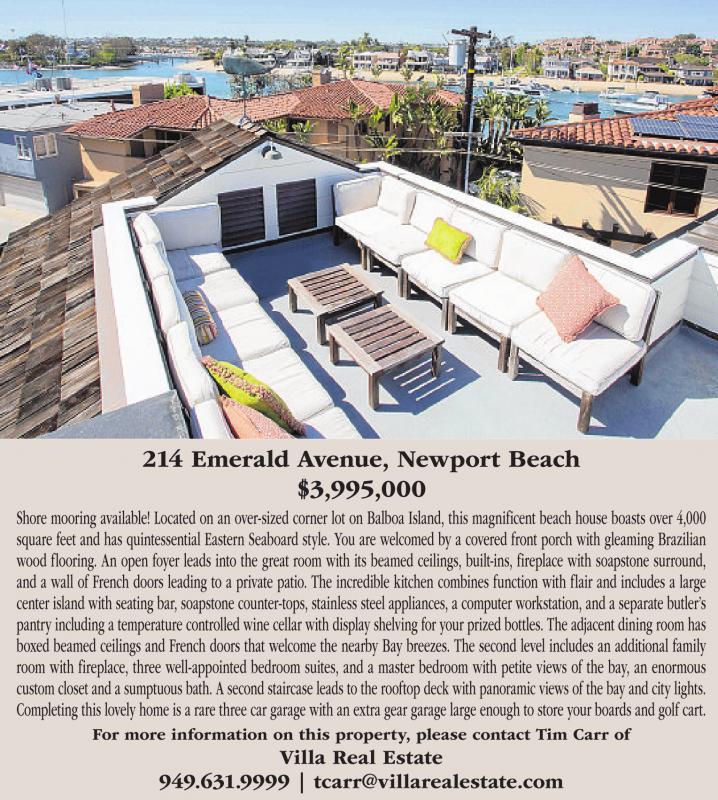 214 Emerald Avenue, Newport Beach $3,995,000 Shore mooring available! Located on an over-sized corner lot on Balboa Island, this magnificent beach house boasts over 4,000 square feet and has quintessential Eastern Seaboard style. You are welcomed by a covered front porch with gleaming Brazilian wood flooring. An open foyer leads into the great room with its beamed ceilings, built-ins, fireplace with soapstone surround, and a wall of French doors leading to a private patio. The incredible kitchen combines function with flair and includes a large center island with seating bar, soapstone counter-tops, stainless steel appliances, a computer workstation, and a separate butler’s pantry including a temperature controlled wine cellar with display shelving for your prized bottles. The adjacent dining room has boxed beamed ceilings and French doors that welcome the nearby Bay breezes. The second level includes an additional family room with fireplace, three well-appointed bedroom suites, and a master bedroom with petite views of the bay, an enormous custom closet and a sumptuous bath. A second staircase leads to the rooftop deck with panoramic views of the bay and city lights. Completing this lovely home is a rare three car garage with an extra gear garage large enough to store your boards and golf cart. For more information on this property, please contact Tim Carr of Villa Real Estate 949.631.9999 | tcarr@villarealestate.com