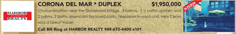 CORONA DEL MAR * DUPLEX $1,950,000 Choice location near the Goldenrod bridge. 3 bdrms. 2 ½ baths upstairs and 2 bdrms. 2 baths downstairs Enclosed patio, Fireplaces in each unit, Very Clean and a Great Value! Call Bill Ring at HARBOR REALTY 949-673-4400 x101