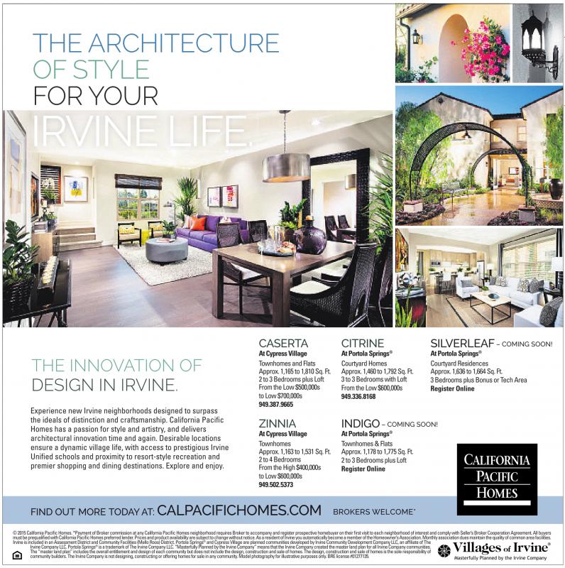 ©2015CaliforniaPacific Homes. *Payment of Broker commission at any California Pacific Homes neighborhood requires Broker to accompany and registerprospective homebuyer on their first visit to each neighborhood of interest and comply with Seller’sBroker Cooperation Agreement. All buyers mustbeprequalifiedwithCaliforniaPacificHomespreferredlender.Pricesandproductavailabilityaresubjecttochangewithoutnotice.AsaresidentofIrvineyouautomaticallybecomeamemberoftheHomeowner’sAssociation.Monthlyassociationduesmaintainthequalityofcommonareafacilities. Irvine is included in an AssessmentDistrict and Community Facilities (Mello Roos) District. Portola Springs ® and Cypress Village are planned communities developed by Irvine Community Development Company LLC, an affiliate of The Irvine Company LLC. Portola Springs ® is atrademark of The Irvine Company LLC. “Masterfully Planned by the Irvine Company” means that the Irvine Company created the master land plan for all Irvine Company communities. The “master land plan” includes the overall entitlement and design of each communitybut does not include the design, construction and sale of homes. The design, construction and sale of homes is the sole responsibility of community builders. The Irvine Company is notdesigning, constructing or offering homes for sale in any community. Modelphotography forillustrative purposes only. BRE license #01277135.