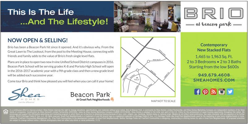 This Is The Life ...And The Lifestyle! NOW OPEN & SELLING! Brio hasbeenaBeaconParkhit sinceitopened.And it’s obviouswhy.Fromthe GreatLawntoThe Lookout, from thepooltothe MeetingHouse,connecting with friendsand family adds to thevalueofBrio’sfresh single levelflats. Plans areinplace to open twonew Irvine UnifiedSchoolDistrictcampuses in 2016. Beacon Park School will be servinggradesK-8 andPortola High Schoolwillopen in the2016-2017academic year with a9th gradeclass andthenanew gradelevel will be addedeachsuccessiveyear. Come tour Brio andthink howpleasedyou will feel whenyou cancallityourhome! 133 Contemporary New Stacked Flats 1,465 to 1,963 Sq. Ft. 2 to 3 Bedrooms • 2 to 3 Baths Starting from the low $600s 949.679.4608 SHEAHOMES.COM MAPNOT TO SCALE In acontinuous effort to improve product, Shea Homes reserves the right tochange elevations, specifications, and materials without prior notice. Brio atBeacon Park, acommunity by Shea Homes Limited Partnership, and Shea Homes Marketing Company are independent members ofthe Shea family ofcompanies. Construction byShea Homes® Limited Partnership (#855368), Sales byShea Homes Marketing Company (CalBRE #01378646). Shea Homes ispledged to the letter and spirit of the U.S. Policy for the achievement of equal housing opportunity throughout the nation. We encourage andsupportthe affirmativeadvertising andmarketing program inwhich thereare no barriers toobtaininghousing becauseofrace, color,religion, sex, handicap, familial status or national origin. Models do notreflectracial preference.See sales counselor withany question or for further details. ©2013 Heritage Fields El Toro, LLC. All rights reserved. Great Park Neighborhoods isatrademark of and the bicycle logo isaregistered trademark of Heritage Fields ElToro, LLC (Heritage Fields) dba Great Park Neighborhoods used for the marketing of new home neighborhoods inIrvine, California. FivePoint Communities Management, Inc. (Five Point Communities) isthe development manager of Great Park Neighborhoods. Neither Heritage Fields nor FivePoint Communities is designing, constructing oroffering homes for sale in Great Park Neighborhoods. All proposed amenities are subject to change without notice. Lifestyle photography does not reflect any ethnic orracial preference. 11/15