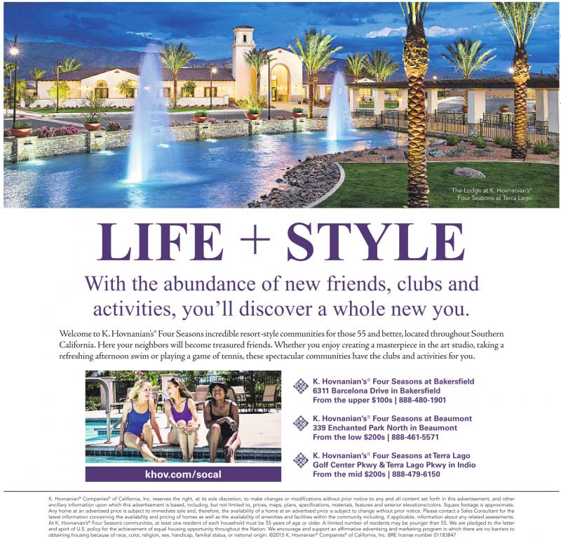 WelcometoK.Hovnanian’s®FourSeasons incredible resort-style communities forthose 55 and better, locatedthroughoutSouthern California.Here your neighbors will become treasured friends. Whether you enjoy creating a masterpiece in the art studio,taking a refreshing afternoon swim or playing a game of tennis,these spectacular communities have the clubs and activities for you.