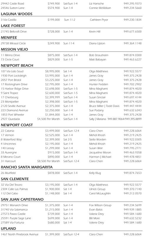 29442 Castle Road $749,900 Sat/Sun 1-4 Liz Hansche 949.295.9373 24546 Sutton Lane $574,900 Sun 1-4 Connie McKibban 949.234.5660 LAGUNA WOODS 3Via Castilla $199,000 Sun 11-2 Cathleen Pryor 949.230.1834 LAKE FOREST 21745 Bellcroft Drive $728,000 Sun 1-4 Kevin Hill 949.677.6500 MENIFEE 29738 Mirasol Circle $249,900 Sun 11-4 Diana Upton 949.364.1148 MISSION VIEJO 11 Mirino Drive $875,000 Sat/Sun 1-4 Bob Strausheim 949.874.0300 73 Circle Court $829,000 Sun 1-5 Matt Babayan 949.463.6227 NEWPORT BEACH 107 Via Lido Soud $8,995,000 Sat 1-4 Olga Matthews 949.922.5577 1930 Port Locksleigh $3,995,000 Sun 1-4 James Gray 949.375.2428 2057 Port Bristol $3,225,000 Sun 1-4 James Gray 949.375.2428 17 Rockingham Drive $2,795,000 Sun 1-4 Hunter Fedden 949.702.2902 15 Harbor Ridge Drive $2,698,000 Sat/Sun 1-5 Mina Maghami 949.874.4020 9Saint Tropez $2,600,000 Sat/Sun 1-5 Mina Maghami 949.874.4020 17 Cherbourg $2,399,999 Sat/Sun 1-4 Susan Sinclair 949.697.4144 23 Montpellier $2,398,000 Sat/Sun 1-5 Mina Maghami 949.874.4020 2120 Seville Avenue $2,375,000 Sun 1-4 Bruce Miller |Todd Davis 949.447.4444 223 Diamond Avenue $2,250,000 Sun 1-4 Sue Podany 949.632.6343 1853 Port Wheeler $1,844,000 Sun 1-4 James Gray 949.375.2428 2927 Quedada $4,500 Per Month Sat/Sun 1-4 Sally |Mariana 949.887.9064/949.395.8899 NEWPORT COAST 22 Catania $3,499,000 Sat/Sun 12-4 Clara Chen 949.228.6064 17 Vernon $2,525,000 Sun 1-4 Mehdi Khosh 949.219.2425 8Waterford Way $2,399,000 Sat 2-5 Stella Worden 949.922.0305 4Vincennes $2,195,000 Sun 1-4 Mehdi Khosh 949.219.2425 140 Lessay $1,299,000 Sun 1-4 Susan Weir 949.795.2771 33 Auvergne $915,000 Sat/Sun 1-4 Jacqueline Moran 949.463.9358 8Merano Court $890,000 Sun 1-4 Harmon |Michael 949.478.4851 31 Harcourt $8,500 Per Month Sat/Sun 12-4 Clara Chen 949.228.6064 RANCHO SANTA MARGARITA 26 Muirfield $878,000 Sat/Sun 1-4 Kelly Klug 949.874.7653 SAN CLEMENTE 32 Via Del Tesoro $3,195,000 Sat/Sun 1-4 Olga Matthews 949.922.5577 2304 Calle Las Palmas $1,900,000 Sat 1-4 Ulnick Group 949.370.7140 112 Del Cabo $1,148,000 Sat 1-4 Carol McLaughlin 949.212.0570 SAN JUAN CAPISTRANO 29751 Monarch Drive $1,375,000 Sun 1-4 Fox Wilson Group 949.234.5699 31740 Via Salamanca $1,215,000 Sun 1-4 Evan Balsis 949.939.1885 27573 Paseo Castile $739,000 Sun 1-4 Valerie Drey 949.584.1680 25591 Purple Sage Lane $699,000 Sun 1-4 Bill More 949.632.5232 27589 Via Fortuna $680,000 Sat 1-4 Valerie Drey 949.584.1680 UPLAND 1467 North Pinebrook Avenue $1,399,000 Sat/Sun 12-4 Clara Chen 949.228.6064