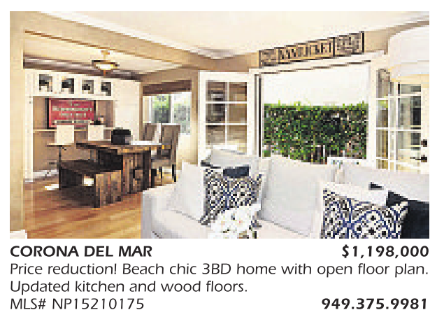 CORONA DEL MAR $1,198,000 Price reduction! Beach chic 3BD home with open floor plan. Updated kitchen and wood floors. MLS# NP15210175 949.375.9981