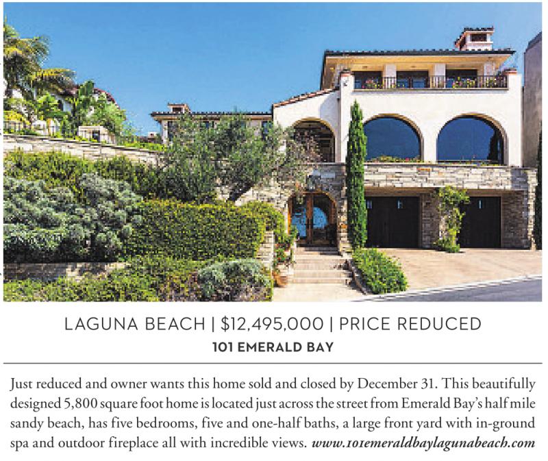 22 LAGUNA BEACH | $12,495,000 | PRICE REDUCED 101 EMERALD BAY Just reduced and owner wants this home sold and closed by December 31. This beautifully designed 5,800squarefoothomeislocatedjustacrossthe street from EmeraldBay’s half mile sandy beach, has five bedrooms, five and one-half baths, a large front yard with in-ground spa and outdoor fireplace all with incredible views. www.101emeraldbaylagunabeach.com