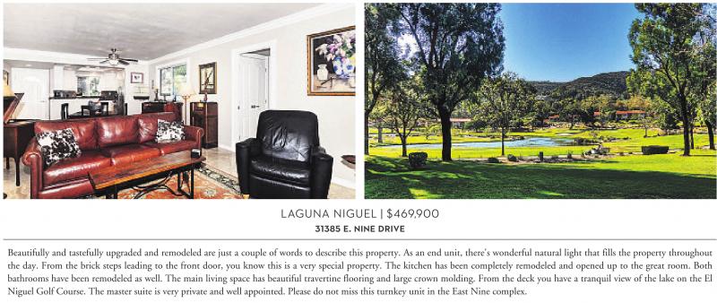 LAGUNA NIGUEL | $469,900 31385 E. NINE DRIVE Beautifully and tastefully upgraded and remodeled are just a couple of words to describe this property. As an end unit, there's wonderful natural light that fills the property throughout the day. From the brick steps leading to the front door, you know this is a very special property. The kitchen has been completely remodeled and opened up to the great room. Both bathrooms have been remodeled as well. The main living space has beautiful travertine flooring and large crown molding. From the deck you have a tranquil view of the lake on the El Niguel Golf Course. The master suite is very private and well appointed. Please do not miss this turnkey unit in the East Nine complex.