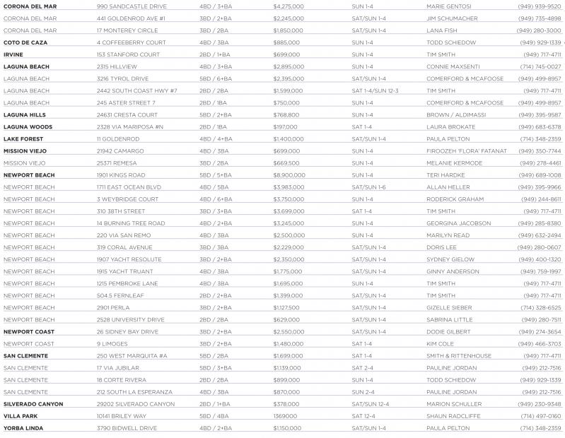 LAGUNA BEACH 245 ASTER STREET 7 2BD / 1BA $750,000 SUN 1-4 COMERFORD & MCAFOOSE (949) 499-8957 LAGUNA HILLS 24631 CRESTA COURT 5BD / 2+BA $768,800 SUN 1-4 BROWN / ALDIMASSI (949) 395-9587 LAGUNA WOODS 2328 VIA MARIPOSA #N 2BD / 1BA $197,000 SAT 1-4 LAURA BROKATE (949) 683-6378 LAKE FOREST 11 GOLDENROD 4BD / 4+BA $1,400,000 SAT/SUN 1-4 PAULA PELTON (714) 348-2359 MISSION VIEJO 21942 CAMARGO 4BD / 3BA $699,000 SUN 1-4 FIROOZEH ‘FLORA’ FATANAT (949) 350-7744 MISSION VIEJO 25371 REMESA 3BD / 2BA $669,500 SUN 1-4 MELANIE KERMODE (949) 278-4461 NEWPORT BEACH 1901 KINGS ROAD 5BD / 5+BA $8,900,000 SUN 1-4 TERI HARDKE (949) 689-1008 NEWPORT BEACH 1711 EAST OCEAN BLVD 4BD / 5BA $3,983,000 SAT/SUN 1-6 ALLAN HELLER (949) 395-9966 NEWPORT BEACH 3 WEYBRIDGE COURT 4BD / 6+BA $3,750,000 SUN 1-4 RODERICK GRAHAM (949) 244-8611 NEWPORT BEACH 310 38TH STREET 3BD / 3+BA $3,699,000 SAT 1-4 TIM SMITH (949) 717-4711 NEWPORT BEACH 14 BURNING TREE ROAD 4BD / 2+BA $3,245,000 SUN 1-4 GEORGINA JACOBSON (949) 285-8380 NEWPORT BEACH 220 VIA SAN REMO 4BD / 3BA $2,500,000 SUN 1-4 MARILYN READ (949) 632-2494 NEWPORT BEACH 319 CORAL AVENUE 3BD / 3BA $2,229,000 SAT/SUN 1-4 DORIS LEE (949) 280-0607 NEWPORT BEACH 1907 YACHT RESOLUTE 3BD / 2+BA $2,350,000 SAT/SUN 1-4 SYDNEY GIELOW (949) 400-1320 NEWPORT BEACH 1915 YACHT TRUANT 4BD / 3BA $1,775,000 SAT/SUN 1-4 GINNY ANDERSON (949) 759-1997 NEWPORT BEACH 1215 PEMBROKE LANE 4BD / 3BA $1,695,000 SUN 1-4 TIM SMITH (949) 717-4711 NEWPORT BEACH 504.5 FERNLEAF 2BD / 2+BA $1,399,000 SAT/SUN 1-4 TIM SMITH (949) 717-4711 NEWPORT BEACH 2901 PERLA 3BD / 2+BA $1,127,500 SAT/SUN 1-4 GIZELLE SIEBER (714) 328-6525 NEWPORT BEACH 2528 UNIVERSITY DRIVE 2BD / 2BA $629,000 SAT/SUN 1-4 SABRINA LITTLE (949) 280-7511 NEWPORT COAST 26 SIDNEY BAY DRIVE 3BD / 2+BA $2,550,000 SAT/SUN 1-4 DODIE GILBERT (949) 274-3654 NEWPORT COAST 9 LIMOGES 3BD / 2+BA $1,480,000 SAT 1-4 KIM COLE (949) 466-3703 SAN CLEMENTE 250 WEST MARQUITA #A 5BD / 2BA $1,699,000 SAT 1-4 SMITH & RITTENHOUSE (949) 717-4711 SAN CLEMENTE 17 VIA JUBILAR 5BD / 3+BA $1,139,000 SAT 2-4 PAULINE JORDAN (949) 212-7516 SAN CLEMENTE 18 CORTE RIVERA 2BD / 2BA $899,000 SUN 1-4 TODD SCHIEDOW (949) 929-1339 SAN CLEMENTE 212 SOUTH LA ESPERANZA 4BD / 3BA $870,000 SUN 2-4 PAULINE JORDAN (949) 212-7516 SILVERADO CANYON 29202 SILVERADO CANYON 2BD / 1+BA $378,000 SAT/SUN 12-4 MARION SCHULLER (949) 230-9348 VILLA PARK 10141 BRILEY WAY 5BD / 4BA 1369000 SAT 12-4 SHAUN RADCLIFFE (714) 497-0160 YORBA LINDA 3790 BIDWELL DRIVE 4BD / 2+BA $1,150,000 SAT/SUN 1-4 PAULA PELTON (714) 348-2359