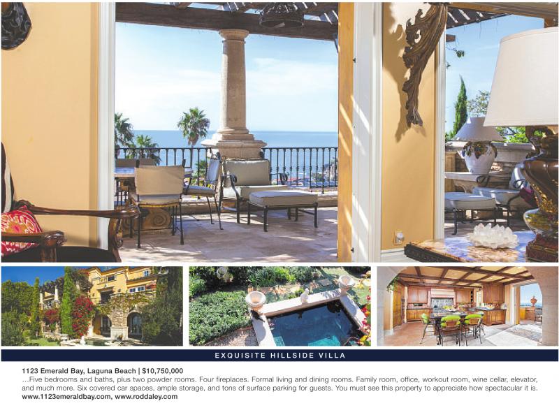 E X Q U I S I T E H I L L S I D E V I L L A 1123 Emerald Bay, Laguna Beach | $10,750,000 …Five bedrooms and baths, plus two powder rooms. Four fireplaces. Formal living and dining rooms. Family room, office, workout room, wine cellar, elevator, and much more. Six covered car spaces, ample storage, and tons of surface parking for guests. You must see this property to appreciate how spectacular it is. www.1123emeraldbay.com, www.roddaley.com See also