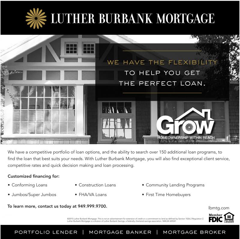 32 we have the flexibility to help you get the perfect loan. We have a competitive portfolio of loan options, and the ability to search over 150 additional loan programs, to find the loan that best suits your needs. With Luther Burbank Mortgage, you will also find exceptional client service, competitive rates and quick decision making and loan processing. Customized financing for: • Conforming Loans • Jumbos/Super Jumbos • Construction Loans • FHA/VA Loans • Community Lending Programs • First Time Homebuyers To learn more, contact us today at 949.999.9700. lbmtg.com ©2015 Luther Burbank Mortgage. This is not an advertisement for extension of credit or acommitment to lend as defined by Section 1026.2 Regulation Z. Luther Burbank Mortgage is adivision of Luther Burbank Savings, afederally chartered savings association. NMLS# 449241 portfolio lender I mortgage banker I mortgage broker