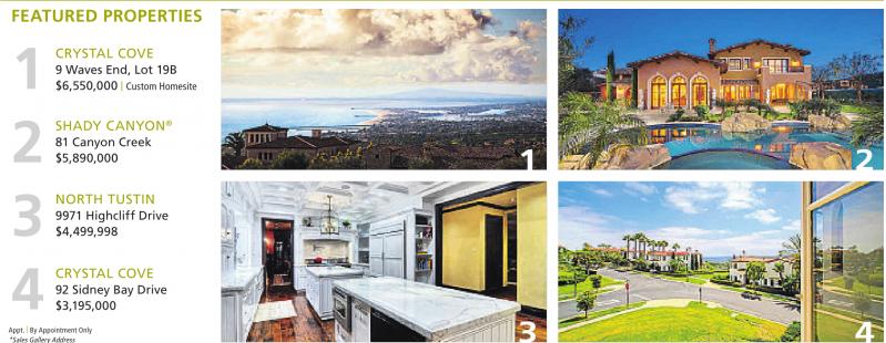 FEATURED PROPERTIES 1 2 3 4 CRYSTAL COVE 9 Waves End, Lot 19B $6,550,000 | Custom Homesite SHADY CANYON ® 81 Canyon Creek $5,890,000 NORTH TUSTIN 9971 Highcliff Drive $4,499,998 CRYSTAL COVE 92 Sidney Bay Drive $3,195,000 Appt. | By AppointmentOnly *SalesGallery Address See also