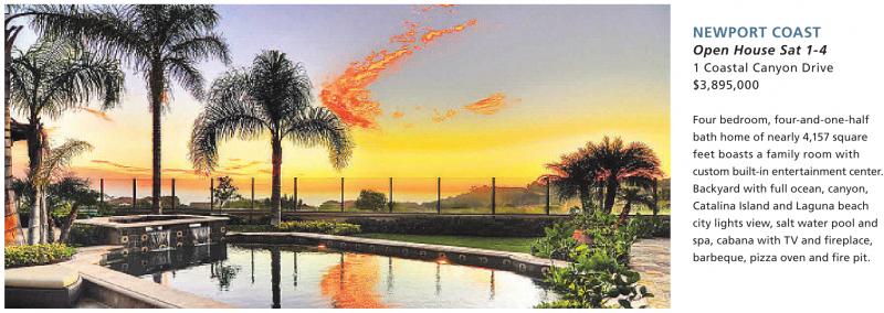 NEWPORT COAST Open House Sat 1-4 1 Coastal Canyon Drive $3,895,000 Four bedroom, four-and-one-half bath home of nearly 4,157 square feet boasts a family room with custom built-in entertainment center. Backyard with full ocean, canyon, Catalina Island and Laguna beach city lights view, salt water pool and spa, cabana with TV and fireplace, barbeque, pizza oven and fire pit. See also