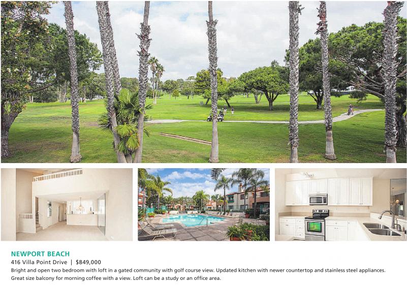 NEWPORT BEACH 416 Villa Point Drive | $849,000 Bright and open two bedroom with loft in a gated community with golf course view. Updated kitchen with newer countertop and stainless steel appliances. Great size balcony for morning coffee with a view. Loft can be a study or an office area.