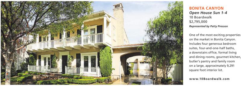 BONITA CANYON Open House Sun 1-4 10 Boardwalk $2,795,000 Represented by Patty Presson One of the most exciting properties on the market in Bonita Canyon. Includes four generous bedroom suites, four-and-one-half baths, a downstairs office, formal living and dining rooms, gourmet kitchen, butler’s pantry and family room on a large, approximately 9,291 square foot interior lot. www.10Boardwalk.com