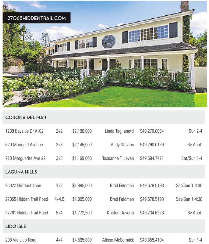 27065HIDDENTRAIL.COM CORONA DEL MAR 1209 Bayside Dr #102 2+2 $2,190,000 Linda Taglianetti 949.270.0034 Sun 2-4 620 Marigold Avenue 3+3 $2,145,000 Andy Stavros 949.290.0139 By Appt. 720 Marguerite Ave#2 3+3 $1,199,000 Roseanne T. Levan 949.584.7771 Sat/Sun 1-4 GUNA HILLS 26022 Flintlock Lane 4+3 $1,895,000 Brad Feldman 949.678.5198 Sat/Sun 1-4:30 27065 Hidden TrailRoad 4+4.5 $1,895,000 Brad Feldman 949.678.5198 Sat/Sun 1-4:30 27761 Hidden TrailRoad 5+4 $1,772,500 Kristen Daverio 949.734.6228 By Appt. LIDO ISLE 208 ViaLido Nord 4+4 $4,595,000 Alison McCormick 949.355.4104 Sun 1-4