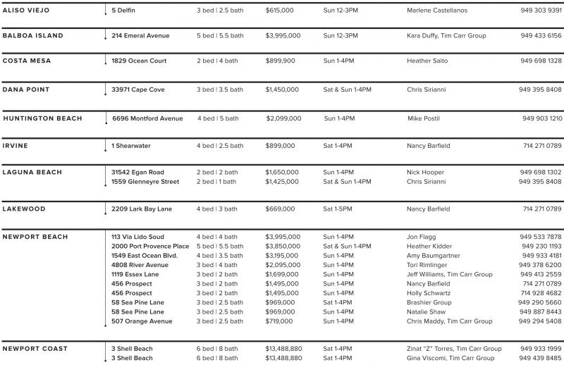 NEWPORT BEACH 113 Via Lido Soud 4 bed | 4 bath $3,995,000 Sun 1-4PM Jon Flagg 949 533 7878 2000 Port Provence Place 5 bed | 5.5 bath $3,850,000 Sat & Sun 1-4PM Heather Kidder 949 230 1193 1549 East Ocean Blvd. 4 bed | 3.5 bath $3,195,000 Sun 1-4PM Amy Baumgartner 949 933 4181 4808 River Avenue 3 bed | 4 bath $2,095,000 Sun 1-4PM Tori Rimlinger 949 378 6200 1119 Essex Lane 3 bed | 2 bath $1,699,000 Sun 1-4PM Jeff Williams, Tim Carr Group 949 413 2559 456 Prospect 3 bed | 2 bath $1,495,000 Sun 1-4PM Nancy Barfield 714 271 0789 456 Prospect 3 bed | 2 bath $1,495,000 Sun 1-4PM Holly Schwartz 714 928 4682 58 Sea Pine Lane 3 bed | 2.5 bath $969,000 Sat 1-4PM Brashier Group 949 290 5660 58 Sea Pine Lane 3 bed | 2.5 bath $969,000 Sun 1-4PM Natalie Shaw 949 887 8443 507 Orange Avenue 3 bed | 2.5 bath $719,000 Sun 1-4PM Chris Maddy, Tim Carr Group 949 294 5408