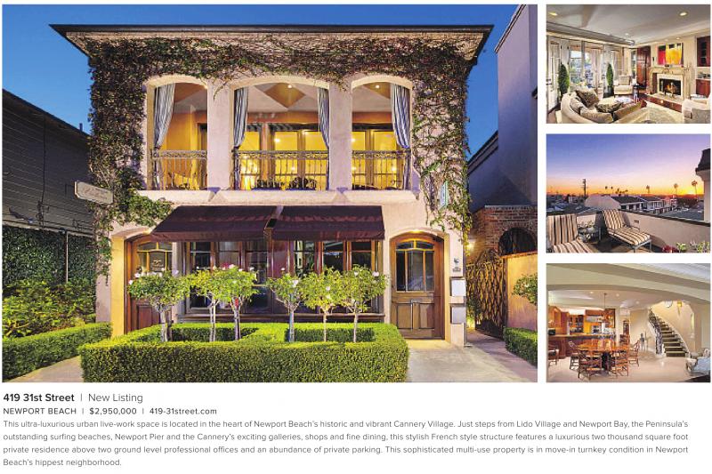 NEWPORT BEACH | $2,950,000 | 419-31street.com This ultra-luxurious urban live-work space is located in the heart of Newport Beach’s historic and vibrant Cannery Village. Just steps from Lido Village and Newport Bay, the Peninsula’s outstanding surfing beaches, Newport Pier and the Cannery’s exciting galleries, shops and fine dining, this stylish French style structure features a luxurious two thousand square foot private residence above two ground level professional offices and an abundance of private parking. This sophisticated multi-use property is in move-in turnkey condition in Newport Beach’s hippest neighborhood.