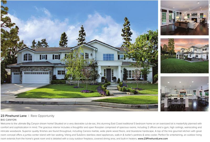 23 Pinehurst Lane | Rare Opportunity BIG CANYON Welcome to the ultimate Big Canyon dream home! Situated on a very desirable cul-de-sac, this stunning East Coast traditional 5 bedroom home on an oversized lot is masterfully planned with comfort and sophistication in mind. The gracious interior includes a thoughtful and open floorplan comprised of spacious rooms, including 2 offices and a gym, high ceilings, wainscoting and intricate woodwork. Superior quality finishes are found throughout, including Carrera marble, wide plank wood floors, and bluestone hardscape. A top of the line gourmet kitchen with great room concept offers a jumbo center island with bar seating, Viking and SubZero stainless steel appliances, walk-in & butler’s pantries & wine cooler. Perfect for entertaining, an outdoor living room extends from the home’s great room and is detailed with a cozy outdoor fireplace, covered dining area, and built-in heaters. www.23PinehurstLane.com