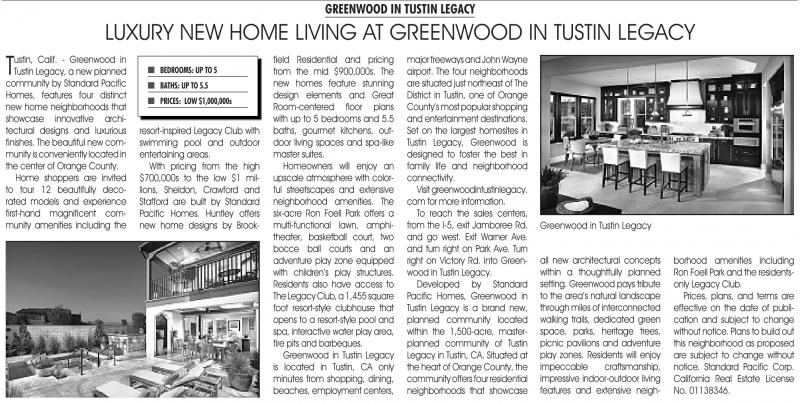 Calif. - Greenwood in Tustin Legacy, anew planned community by Standard Pacific Homes, features four distinct new home neighborhoods that showcase innovative architectural designs and luxurious finishes. The beautiful new community is conveniently located in the center of Orange County.