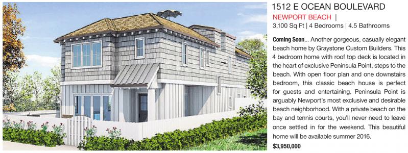 1512 E OCEAN BOULEVARD NEWPORT BEACH | 3,100 Sq Ft | 4 Bedrooms | 4.5 Bathrooms Coming Soon... Another gorgeous, casually elegant beach home by Graystone Custom Builders. This 4 bedroom home with roof top deck is located in theheart of exclusivePeninsula Point, stepstothe bedroom, this classic beach house is perfect for guests and entertaining. Peninsula Point is arguably Newport’s most exclusive and desirable beach neighborhood. With a private beach on the bay and tennis courts, you’ll never need to leave once settled in for the weekend. This beautiful home will be available summer 2016. $3,950,000