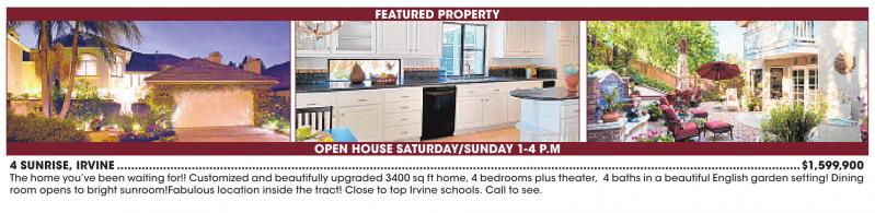 FEATURED PROPERTY OPEN HOUSE SATURDAY/SUNDAY 1-4 P.M 4 SUNRISE, IRVINE ................................................................................................................................................................................................$1,599,900 The home you’ve been waiting for!! Customized and beautifully upgraded 3400 sq ft home, 4 bedrooms plus theater, 4 baths in a beautiful English garden setting! Dining room opens to bright sunroom!Fabulous location inside the tract! Close to top Irvine schools. Call to see. See also
