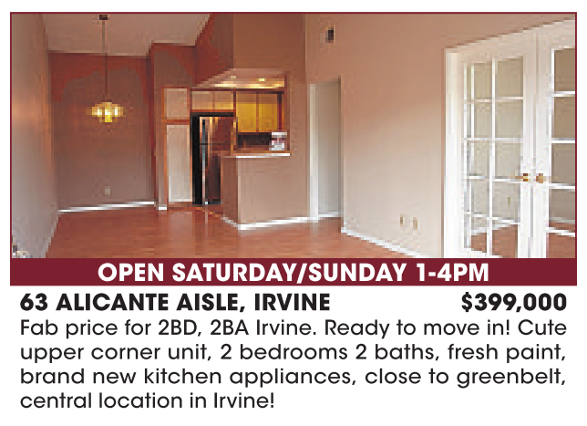 OPEN SATURDAY/SUNDAY 1-4PM 63 ALICANTE AISLE, IRVINE $399,000 Fab price for 2BD, 2BA Irvine. Ready to move in! Cute upper corner unit, 2 bedrooms 2 baths, fresh paint, brand new kitchen appliances, close to greenbelt, central location in Irvine!