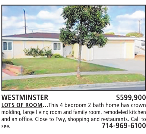 WESTMINSTER $599,900 LOTS OF ROOM…This 4 bedroom 2 bath home has crown molding,large living room and family room, remodeledkitchen and anoffice. Close toFwy, shopping and restaurants. Call to see. 714-969-6100