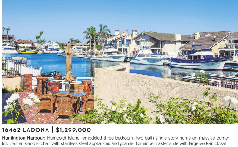 16462 LADONA | $1,299,000 Huntington Harbour: Humboldt Island remodeled three bedroom, two bath single story home on massive corner lot. Center island kitchen with stainless steel appliances and granite, luxurious master suite with large walk-in closet.