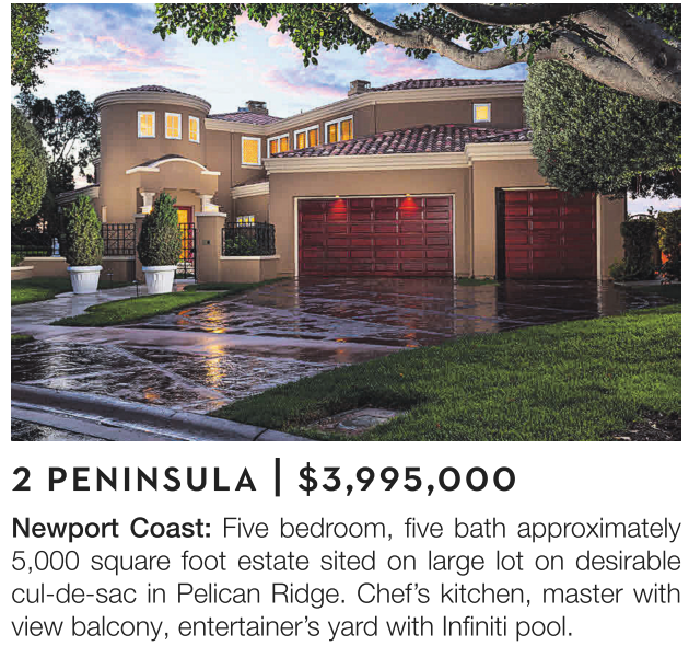 Newport Coast: Five bedroom, five bath approximately 5,000 square foot estate sited on large lot on desirable cul-de-sac in Pelican Ridge. Chef’s kitchen, master with view balcony, entertainer’s yard with Infiniti pool.