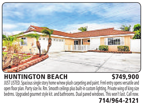 HUNTINGTON BEACH $749,900 JUST LISTED. Spacious singlestoryhome w/newplush carpeting andpaint. Frml entryopens versatileand openfloorplan. Partysize liv. Rm. Smooth ceilings plus built-in custom lighting.Private wing of king size bedrms.Upgraded gourmetstyle kit. and bathrooms. Dual panedwindows. This won’tlast. Call now.