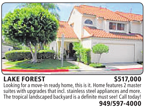 LAKE FOREST $517,000 Looking for amove-inready home,this is it.Homefeatures2master suites with upgrades that incl.stainless steelappliancesand more. Thetropical landscapedbackyard is adefinite mustsee!Calltoday!