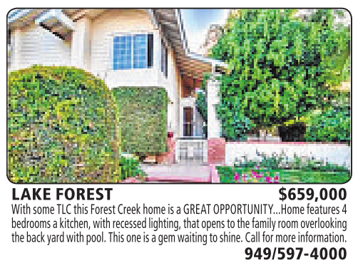 LAKE FOREST $659,000 With some TLCthis Forest CreekhomeisaGREAT OPPORTUNITY...Home features 4 bedrooms akitchen,withrecessed lighting,thatopens to thefamily roomoverlooking thebackyardwithpool. This one is agem waiting to shine. Call for more information. 949/597-4000 See also