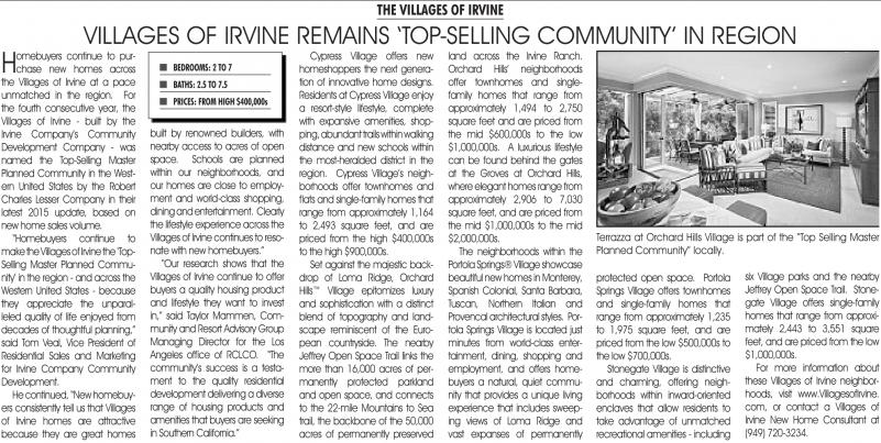 “Homebuyers continue to make the Villages of Irvine the ‘Top- Selling Master Planned Community’ in the region-and acrossthe Western United States - because they appreciate the unparalleled quality of life enjoyed from decades of thoughtful planning,” said Tom Veal, Vice President of Residential Sales and Marketing for Irvine Company Community Development.