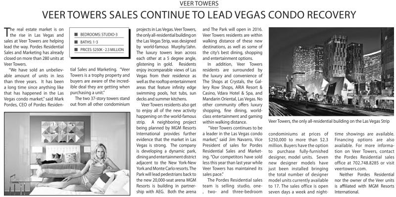 “Veer Towers continues to be a leader in the Las Vegas condo market,” said Jim navarro, Vice President of sales for Pordes Residential Sales and Marketing.“Our competitors have sold less this year than last year while Veer Towers has maintained its sales pace.”