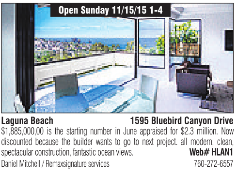 Laguna Beach Open Sunday 11/15/15 1-4 1595 Bluebird Canyon Drive Daniel Mitchell /Remaxsignatureservices 760-272-6557 $1,885,000,00 is the starting number in June appraised for $2.3 million. Now discounted because the builder wants to go to next project. all modern, clean, spectacular construction, fantasticocean views. Web# HLAN1 See also