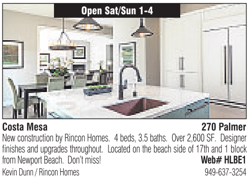 Costa Mesa Open Sat/Sun 1-4 270 Palmer Kevin Dunn /Rincon Homes 949-637-3254 New construction by Rincon Homes. 4beds, 3.5 baths. Over 2,600 SF. Designer finishes and upgrades throughout. Located on the beach side of 17th and 1block from Newport Beach. Don’t miss! Web# HLBE1 See also