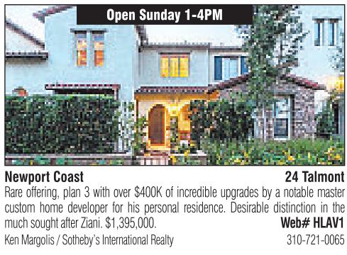 Newport Coast Open Sunday 1-4PM Rare offering, plan 3with over $400K ofincredible upgrades by anotable master custom home developer for his personal residence. Desirable distinction in the much sought after Ziani. $1,395,000. Web# HLAV1 24 Talmont KenMargolis /Sotheby’sInternational Realty 310-721-0065