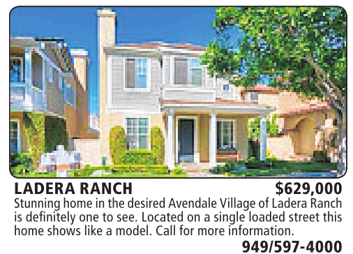 LADERA RANCH $629,000 Stunninghomeinthe desiredAvendaleVillage of Ladera Ranch is definitely one to see. Located on asingle loaded street this home showslikeamodel. Call for moreinformation.