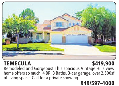TEMECULA $419,900 Remodeled and Gorgeous! This spacious Vintage Hills view homeofferssomuch.4BR, 3Baths,3-car garage,over2,500sf of living space. Call for aprivate showing.