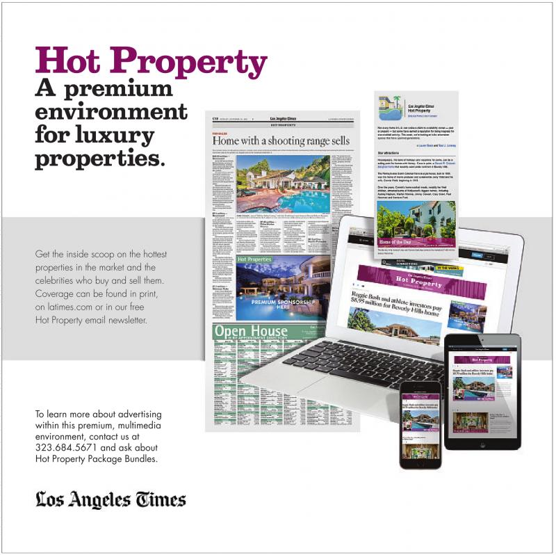 Hot Property A premium environment for luxury properties. Get the inside scoop on the hottest properties in the market and the celebrities who buy and sell them. Coverage can be found in print, on latimes.com or in our free Hot Property email newsletter. To learn more about advertising within this premium, multimedia environment, contact us at 323.684.5671 and ask about Hot Property Package Bundles.