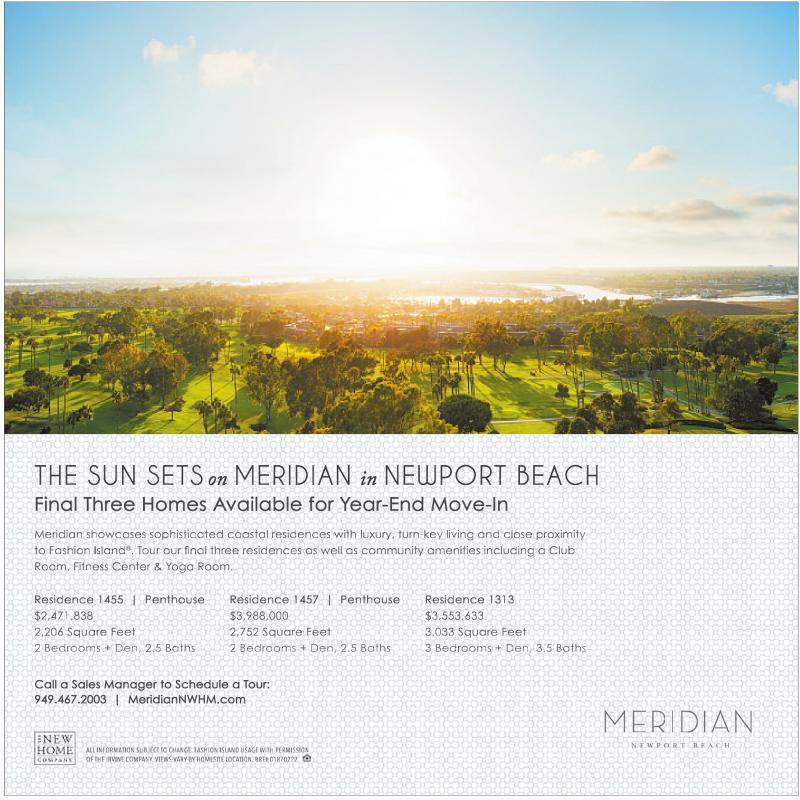 THE SUN ETS on MERIDIAN in NEWPORT BEACH Final Three Homes Available for Year-End Move-In Meridian showcases sophisticated coastal residences with luxury, turn-key living and close proximity to Fashion Island ® . Tour our final three residences as well as community amenities including a Club Room, Fitness Center & Yoga Room. Residence 1455 | Penthouse $2,471,838 2,206 Square Feet 2 Bedrooms + Den, 2.5 Baths Residence 1457 | Penthouse $3,988,000 2,752 Square Feet 2 Bedrooms + Den, 2.5 Baths Residence 1313 $3,553,633 3,033 Square Feet 3 Bedrooms + Den, 3.5 Baths Call a Sales Manager to Schedule a Tour: 949.467.2003 | MeridianNWHM.com ALL INFORMATION SUBJECT TO CHANGE. FASHION ISLAND USAGE WITH PERMISSION OF THE IRVINE COMPANY. VIEWS VARY BY HOMESITE LOCATION. BRE# 01870227.