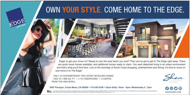 OWN YOUR STYLE. COME HOME TO THE EDGE. ONLY 19 CONTEMPORARY TWO-STORY DETACHED HOMES 1,804 TO 1,896 SQ. FT. • 2 TO 3 BEDROOMS • 2.5 BATHS FROM THE HIGH $700’s 3067 Paragon, Costa Mesa, CA 92626 • 714.540.0156 • Open Daily: 10am - 5pm; Wednesday 2 - 5pm Pricing, plansand specificationsare subject to change without notice.SalesbyShea Homes®MarketingCompany (CalBRE#01378646),Construction by Shea Homes Limited Partnership,License[#855368]. Artist’s renderingsbasedonproposeddevelopment plans, whichare subjecttochange without notice.Modelsdonot indicate racialpreference. Trademarksare theproperties of their respectiveowners. 11/15 SHEAHOMES.COM