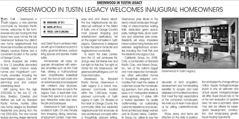 Calif. - Greenwood in Tustin Legacy, a new planned community by Standard Pacific Homes, welcomes its first homeowners who are moving intotheir brand new luxury homes this fall. Greenwood features four distinct new home neighborhoods that showcase innovative architectural designs, luxurious finishes and a convenient location in the center of Orange County.