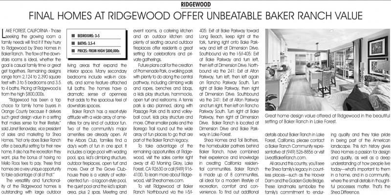“Ridgewood has been a top choice for family home buyers in Orange County because it delivers such great design value in a setting that makes sense for their lifestyle,” said Janet Benavidez, vice president of sales and marketing for Shea Homes. “not only does Baker Ranch offer a beautiful setting for their new home,italso has the recreation they want, plus the bonus of having no mello Roos fees to pay. These final homes are avery unique opportunity to take advantage of all of that.”