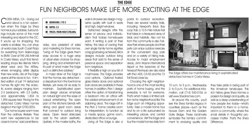 videz, vice president of sales and marketing for Shea Homes. “Living at The edge gives them easy access to a huge array of urban-style choices for shopping, dining and entertainment.