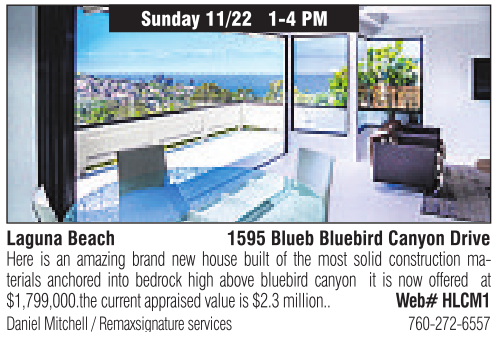 Here is an amazing brand new house built of the most solid construction materials anchored into bedrock high above bluebird canyon it is now offered at $1,799,000.the currentappraised value is $2.3 million.. Web# HLCM1